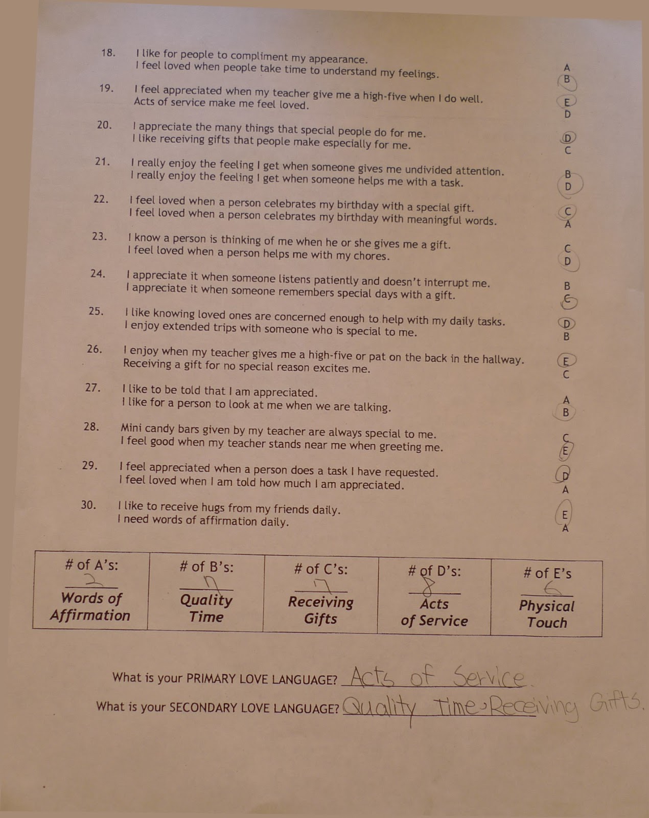 今天Zoe有項回家功課是Love Language Quiz,Jello陪著她寫,越看越熟悉,咦!這不是「彩虹生命教育」的初階培訓,規定要寫的讀書報告,「愛之語」,一書中的內容嗎?